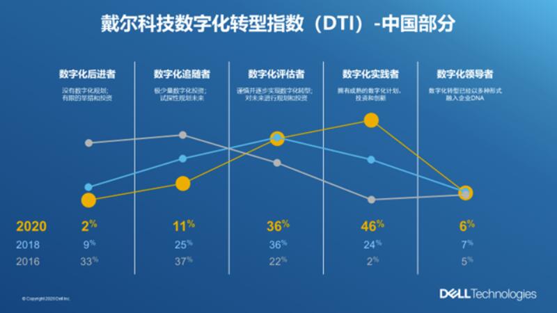 DTI指数调研和分析企业决策者对数字化转型的现状认知、规划和实践。结果显示,6%的中国受访企业是“数字化领导者”。“数字化实践者”..